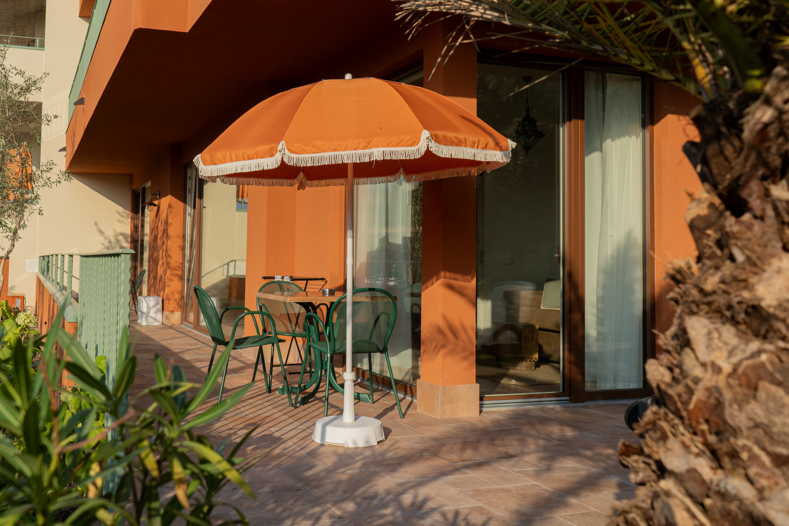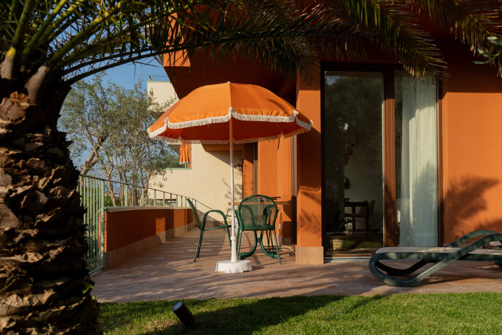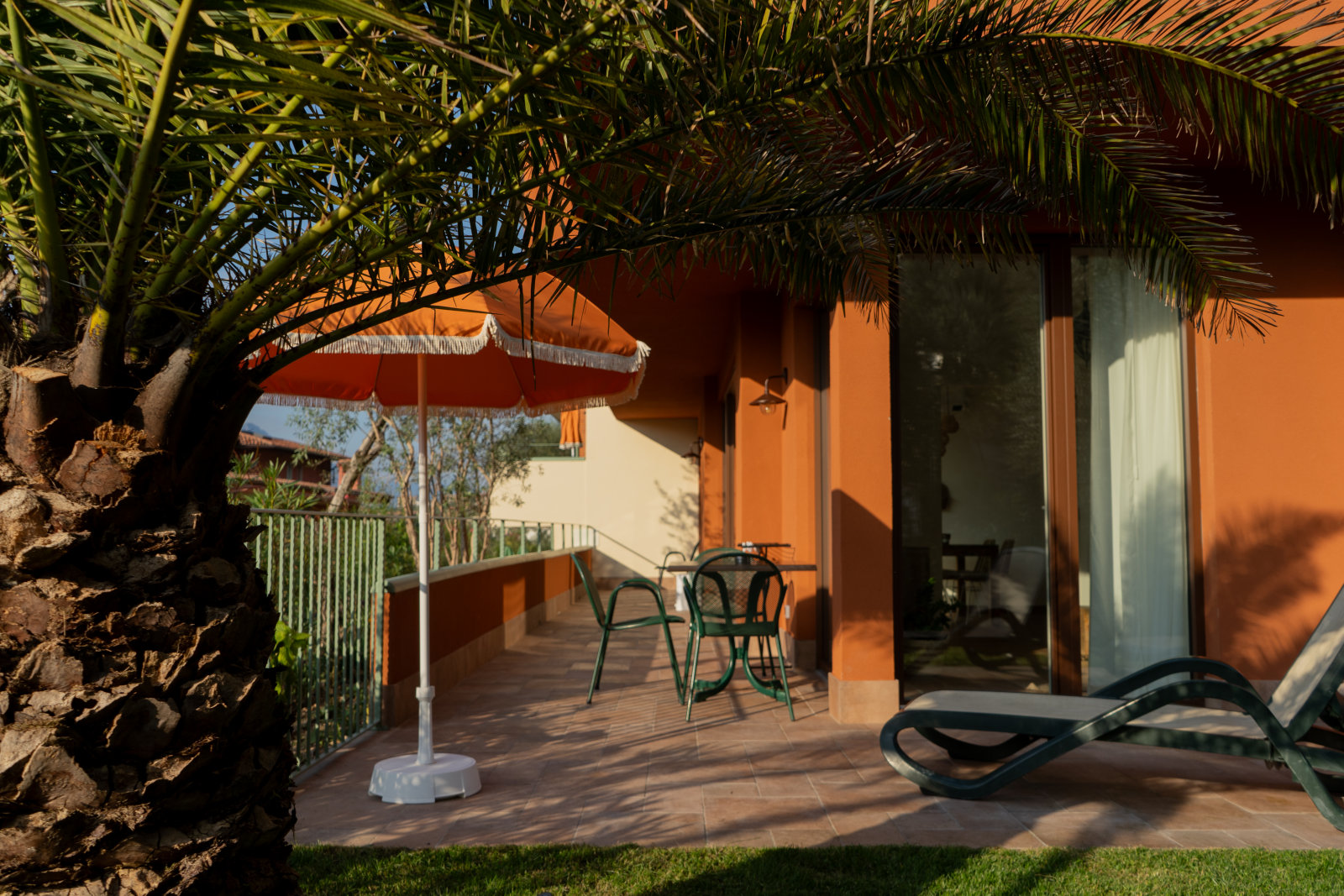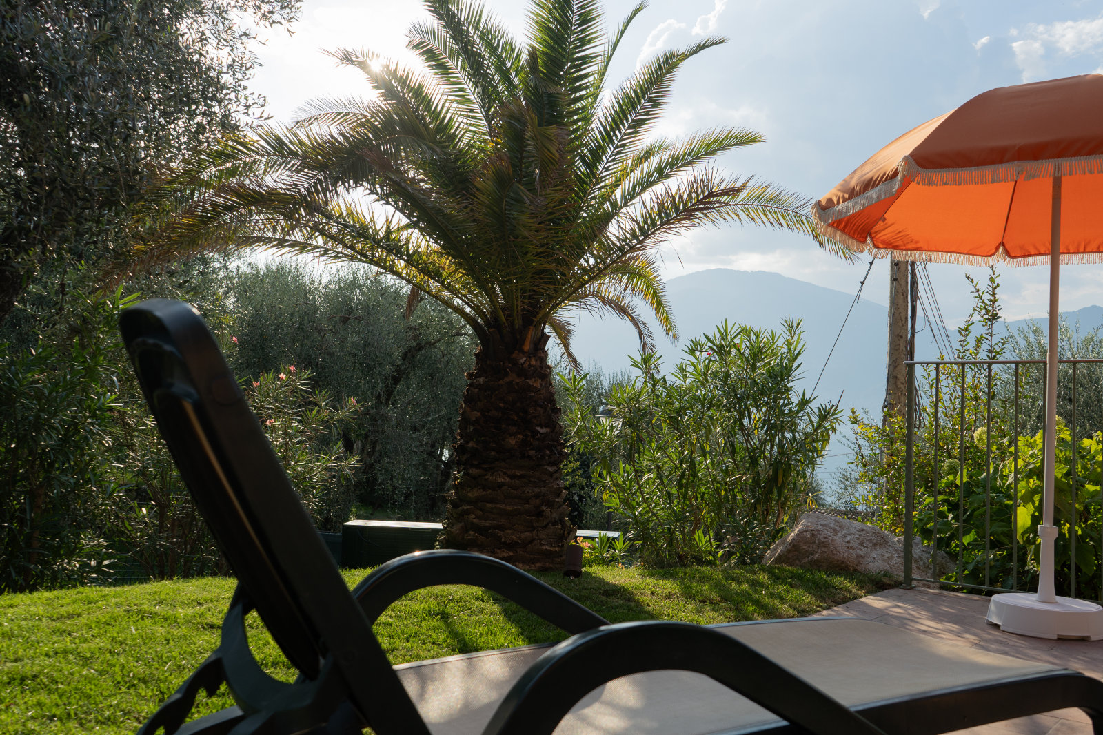 • Terrace with small garden with lake view  equipped with table, chairs, sunlounger and umbrella.