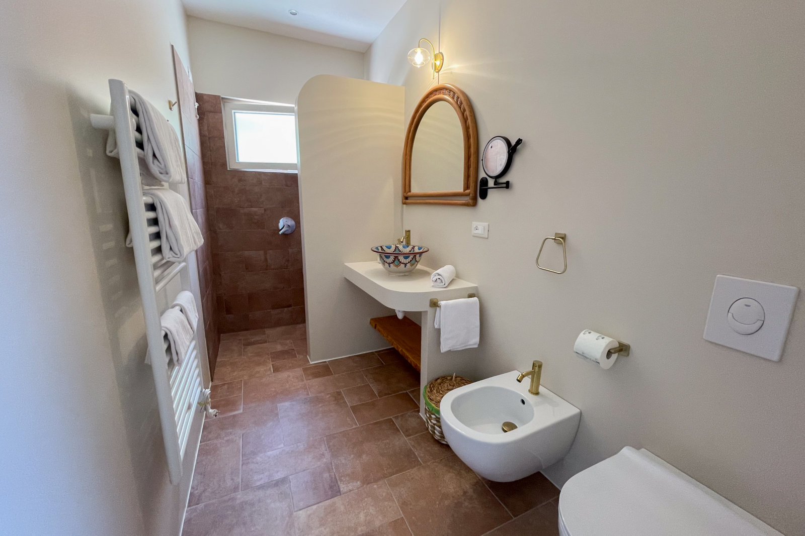 • Bathroom with shower, bidet, hairdryer and magnifying mirror.